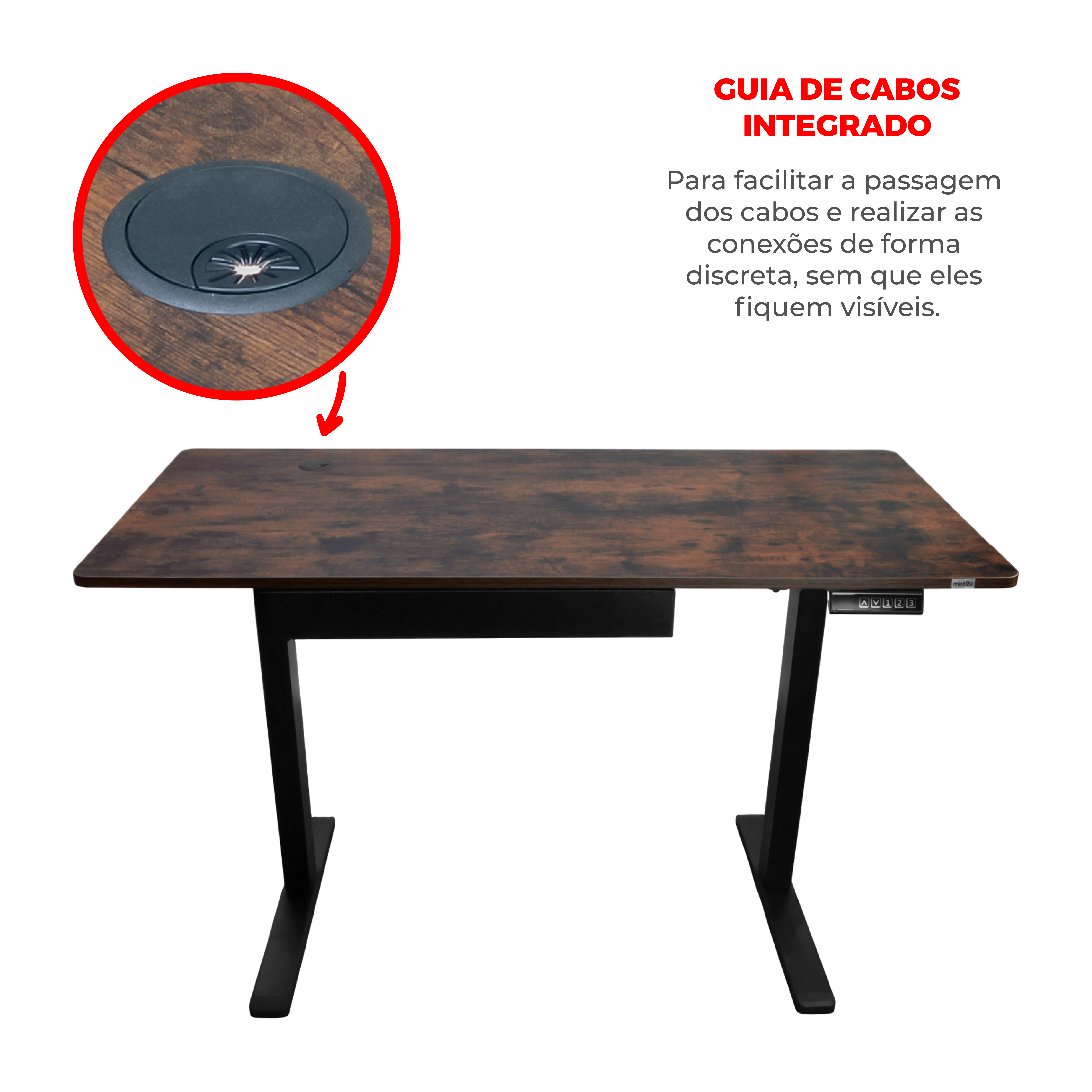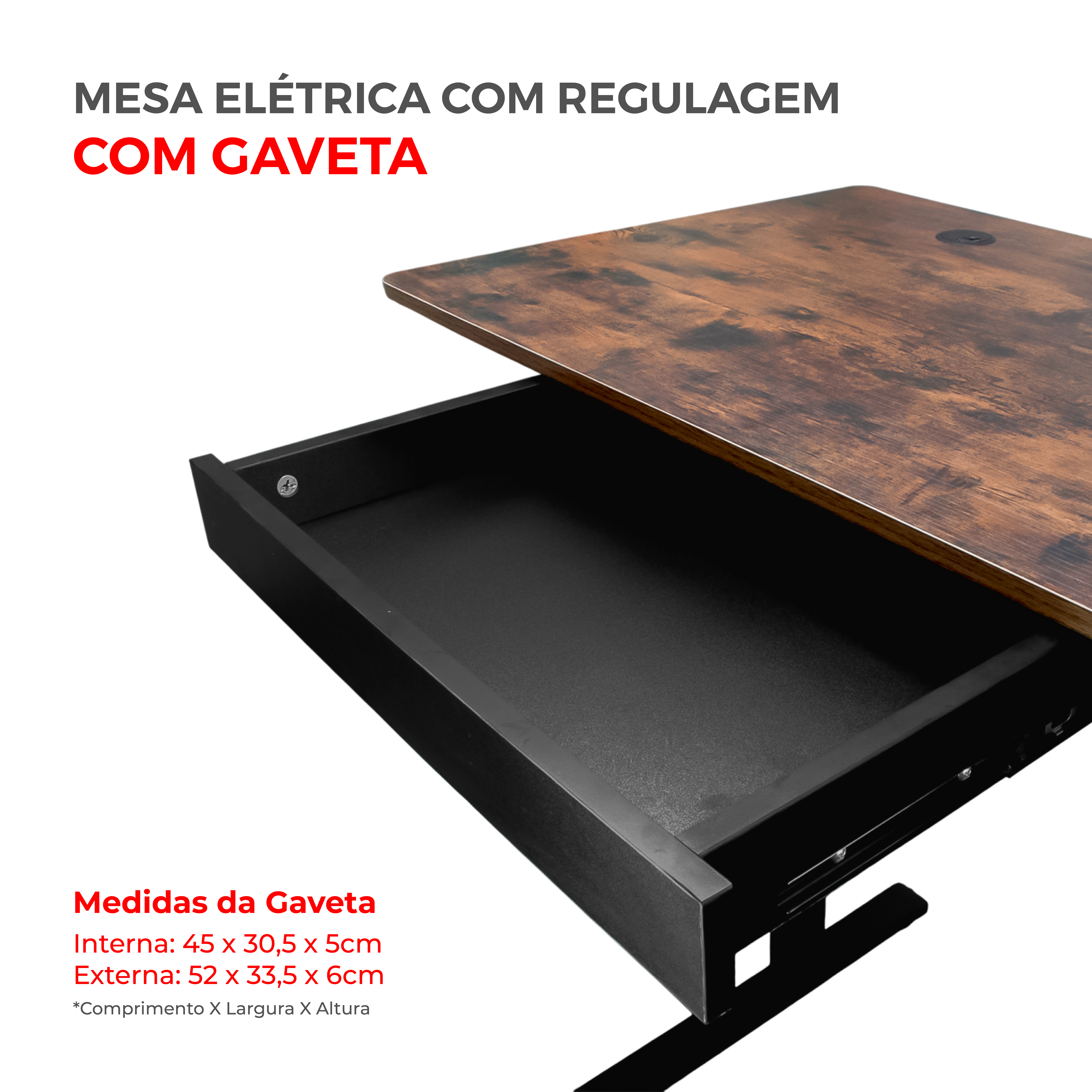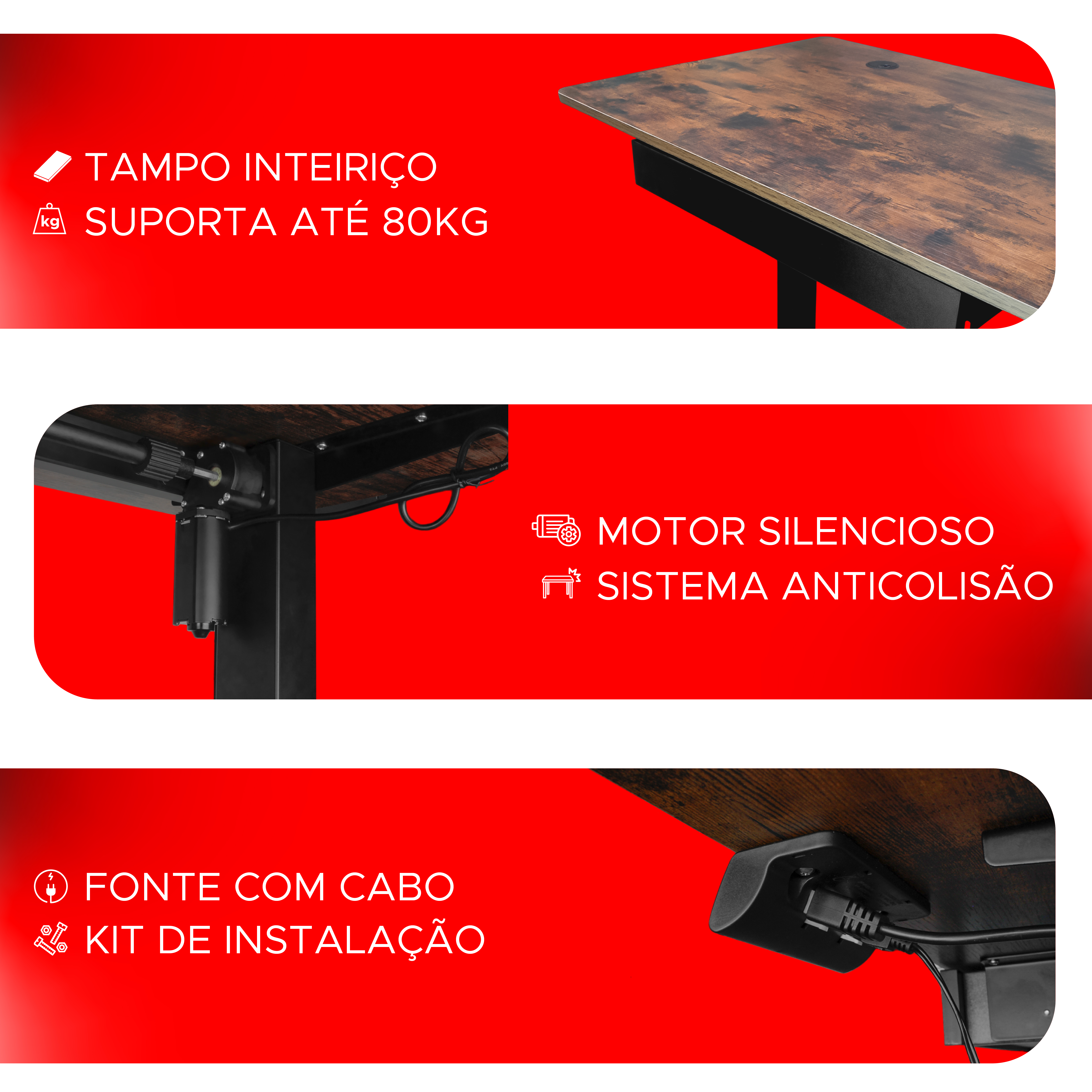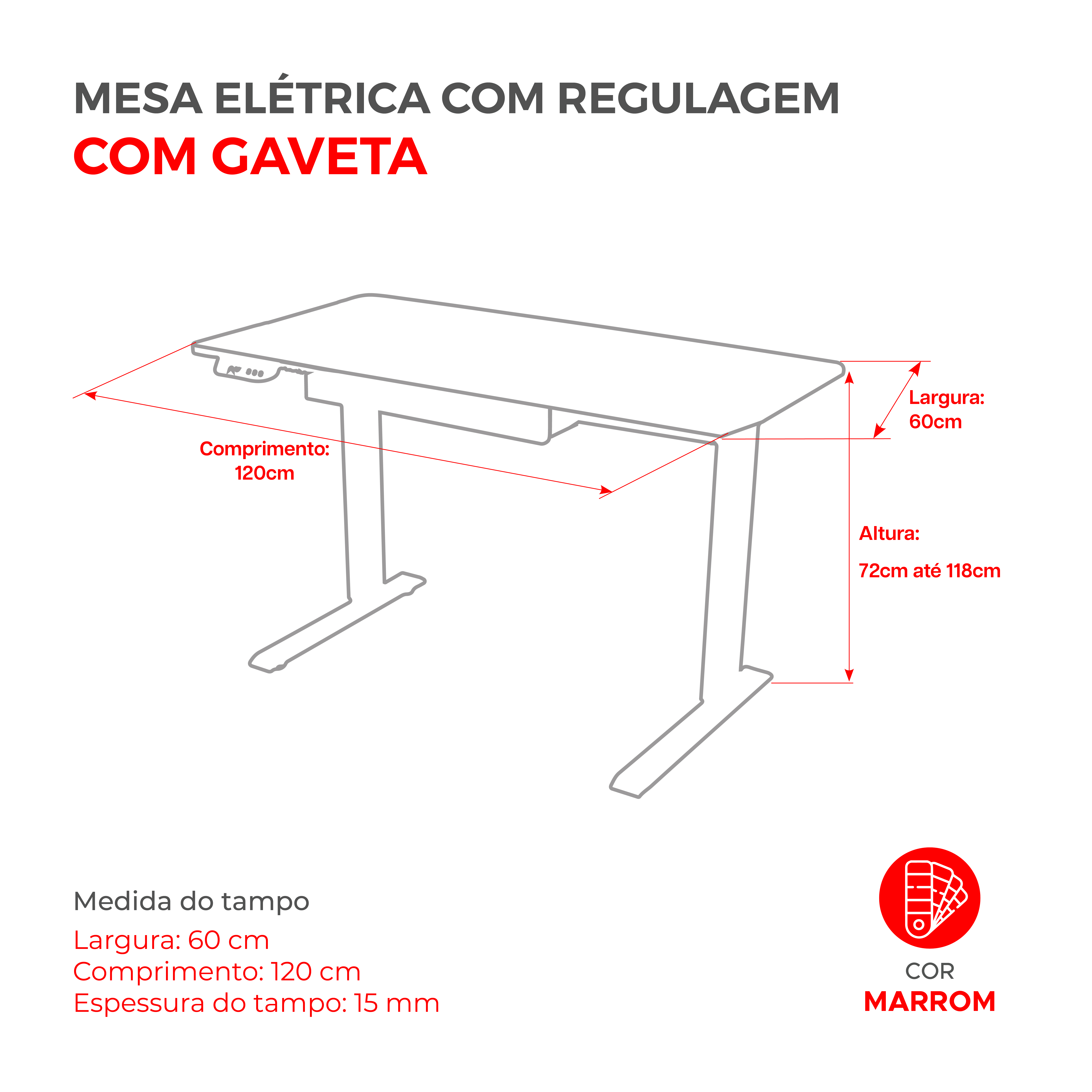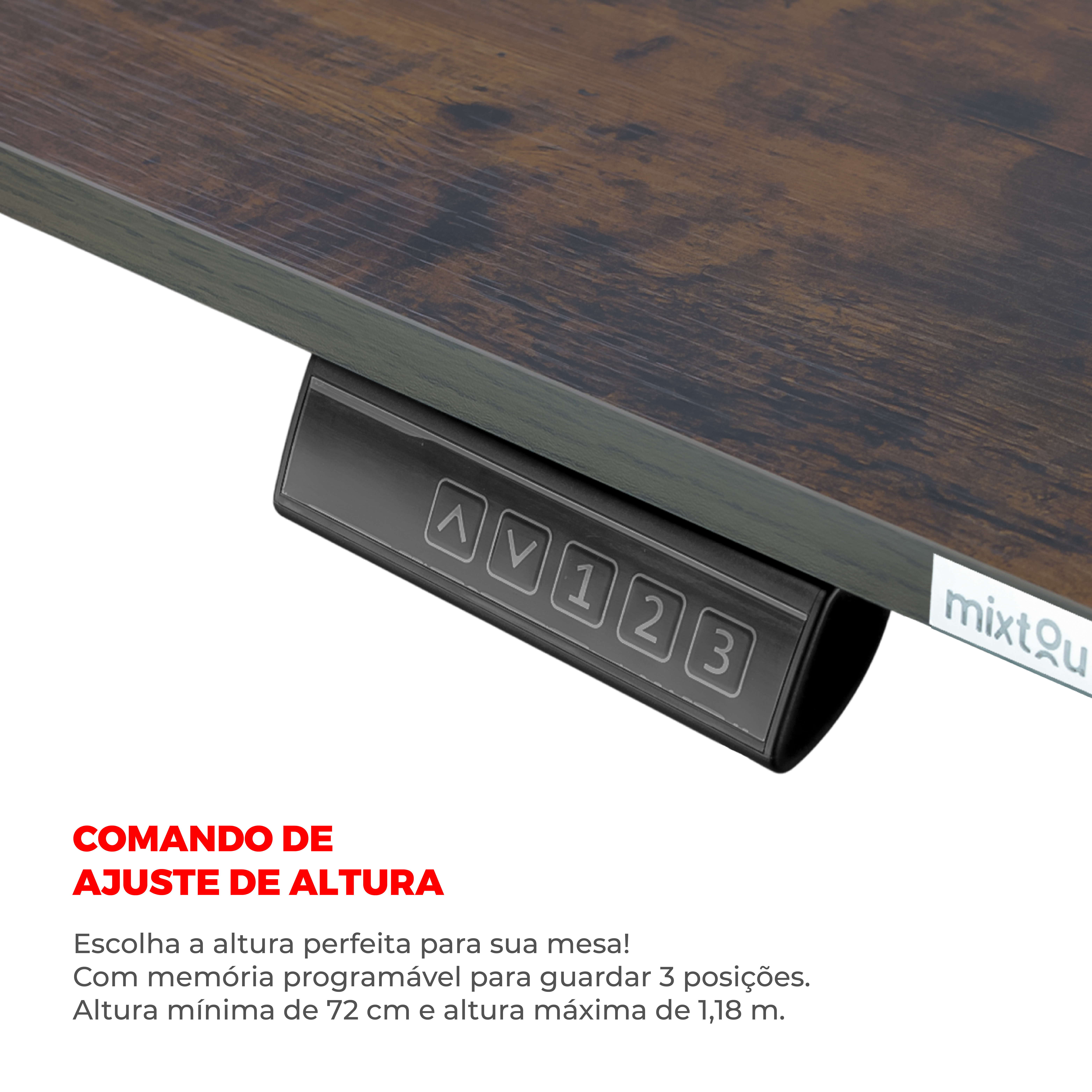 A mesa elétrica com motor é perfeita para quem busca conforto e ergonomia no trabalho ou home office. Com design moderno, permite ajustar a altura com um toque no painel digital, promovendo uma postura saudável, seja sentado ou em pé. Sua superfície de madeira resistente, fácil de limpar, suporta até 80 kg. Inclui uma gaveta para objetos essenciais e um guia de cabos integrado, mantendo o espaço organizado. O sistema anticolisão identifica obstáculos durante o movimento, interrompendo o motor automaticamente para evitar danos, garantindo segurança e praticidade no uso diário. Principais Características Suporte até 80kg de peso. Com memória programável para guardar até 3 posições. Altura Mínima 72cm e Altura máxima de 1,18 metros. Com Gaveta, organize e mantenha tudo sempre ao seu alcance. Medidas da gaveta - 45x30,5x5cm (comprimento x largura x altura). Guia de cabos no tampo para passagem de fios. Medidas do tampo 120x60cm (largura x comprimento) Espessura do tampo de MDF 15mm Tampo inteiriço de MDF sem emendas. Motor silencioso com sistema anti colisão Acompanha fonte bivolt e manual de instalação detalhado